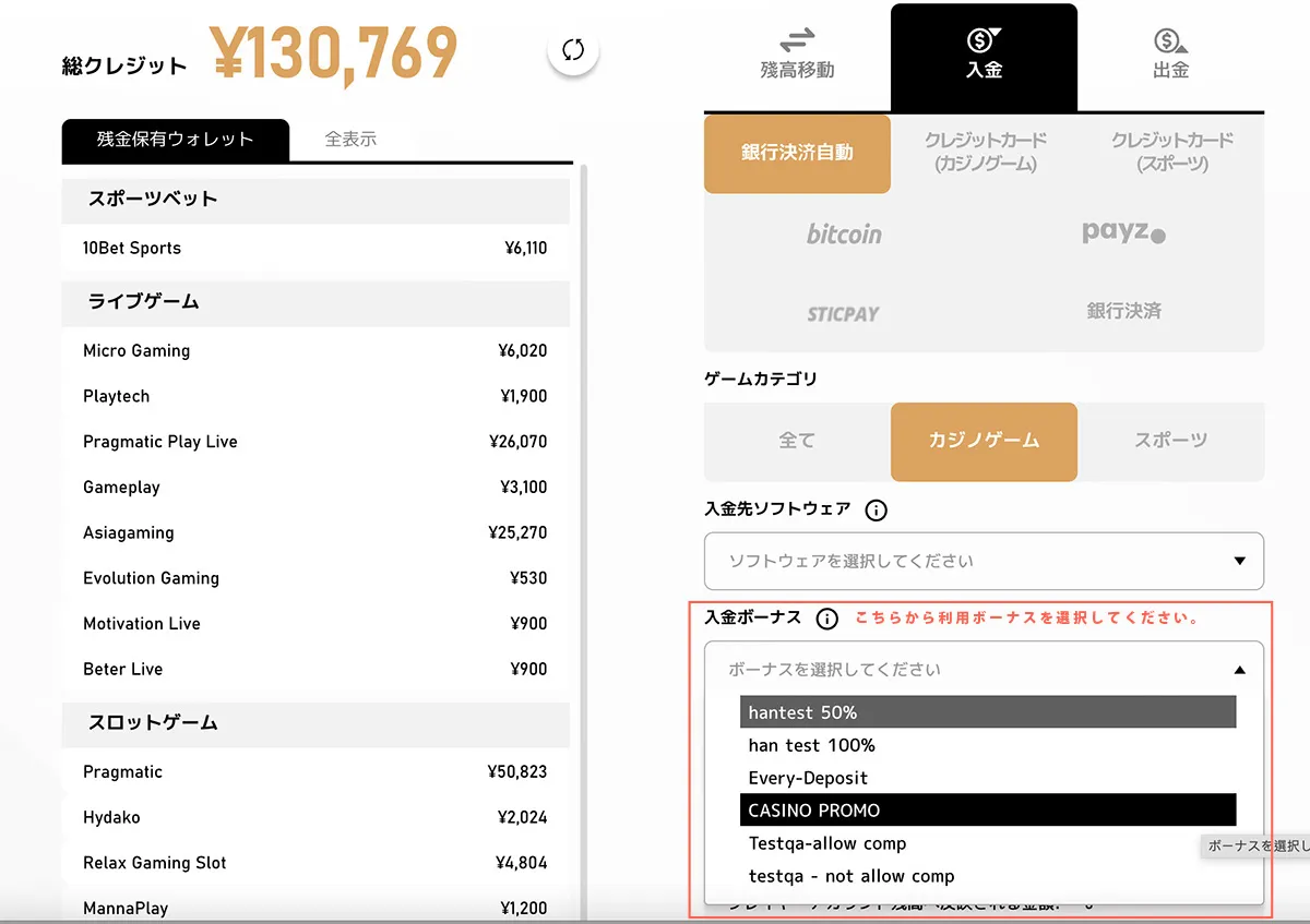注意:ボーナスは1度に1つしか使用できません。新しいボーナスを申請する前に、使用中のボーナスの出金条件を達成するか、キャンセルしてください。また、ボーナス使用中の出金はボーナスキャンセルとなる場合があります。