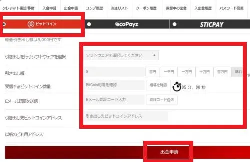 出金方法を選択し、出金額と振込先情報を入力して「出金申請」をクリックします。