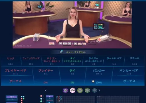 Microgaming社が提供するライブカジノです。同社はオンラインカジノ業界の老舗大手で信頼性が高く、ライブバカラを中心に高額ベットが可能なテーブルが揃っています。 バカラのマックスベットは300万円と高水準で、ハイローラーにも人気のプロバイダです。