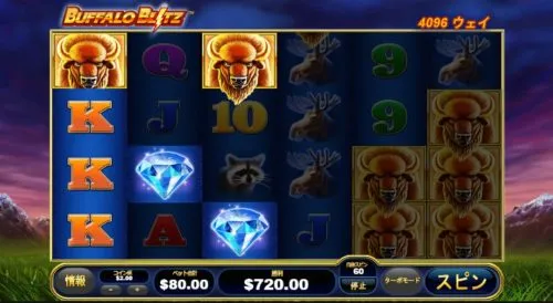 ペイライン4,096本という圧倒的な多さが特徴。スキャッター3つでフリースピン8回・6つで100回獲得です。フリースピン中にダイヤのワイルドが出ると2〜5倍のマルチプライヤーが付与。フリースピン中も追加スピンが狙えるため、連続でボーナスが続くこともあります。