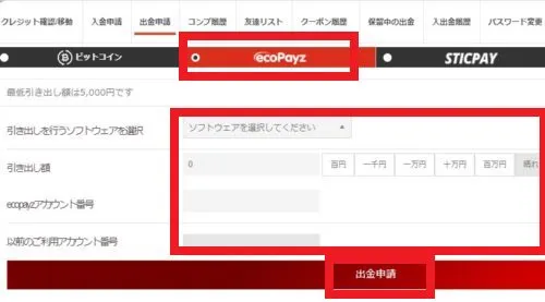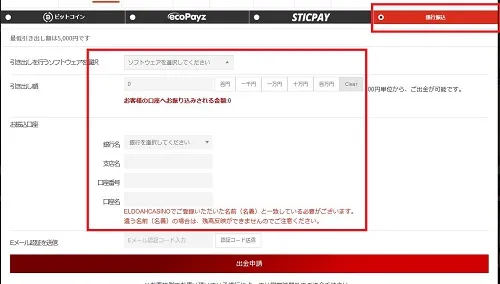 出金方法を選択し、出金額と振込先情報を入力して「出金申請」をクリックします。